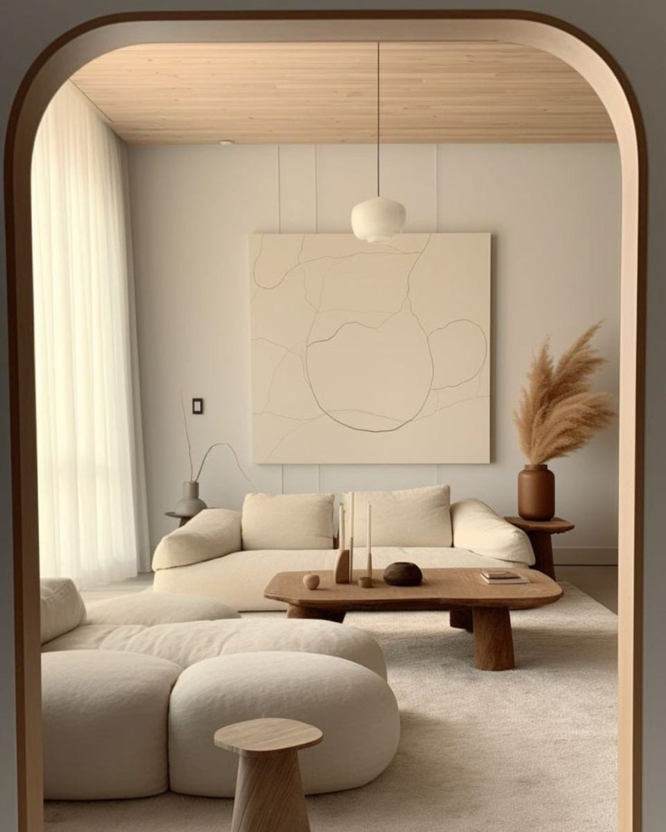 The white oak mixed with the tone on tone creams and curved furnishings beckon comfort. The arched entry cladded in white oak is a well finished touch to the room.